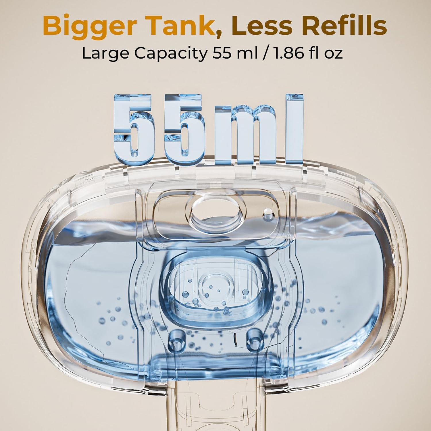 El depósito transparente 55 ml permite cepillados largos sin interrupciones. La ventana visual muestra claramente el nivel de agua. Ideal para sesiones prolongadas en hogares con varios gatos o mascotas de pelaje abundante.