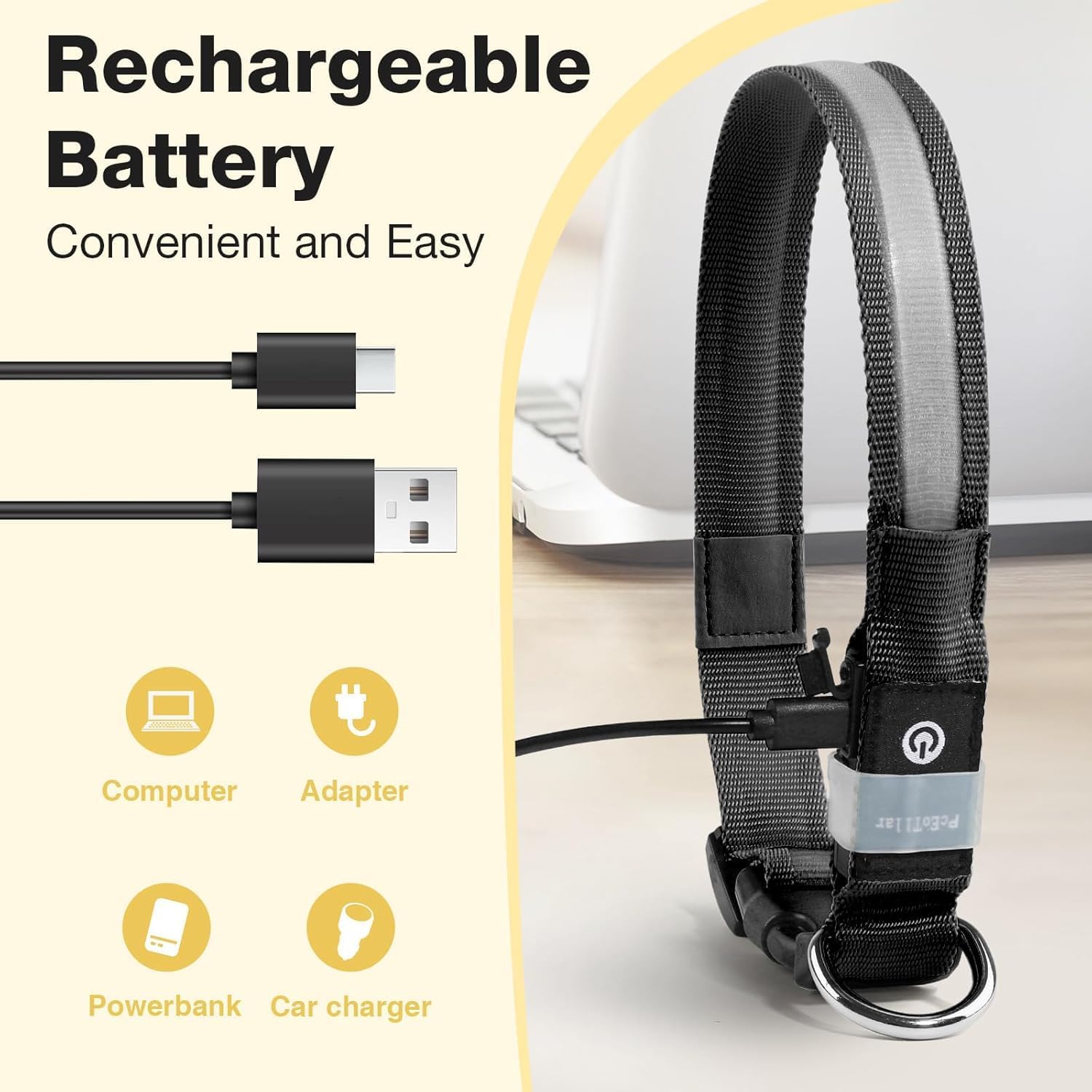 Este collar luminoso sólo necesita cargarse durante 1 hora y después se ilumina durante 7-8 horas para que tu perro pueda salir con seguridad en cualquier momento. Con el cable de carga incluido, se puede cargar mediante cargador, power bank u ordenador. Nuestro collar luminoso recargable no necesita cambio de pilas, lo que le ahorra tiempo y dinero.